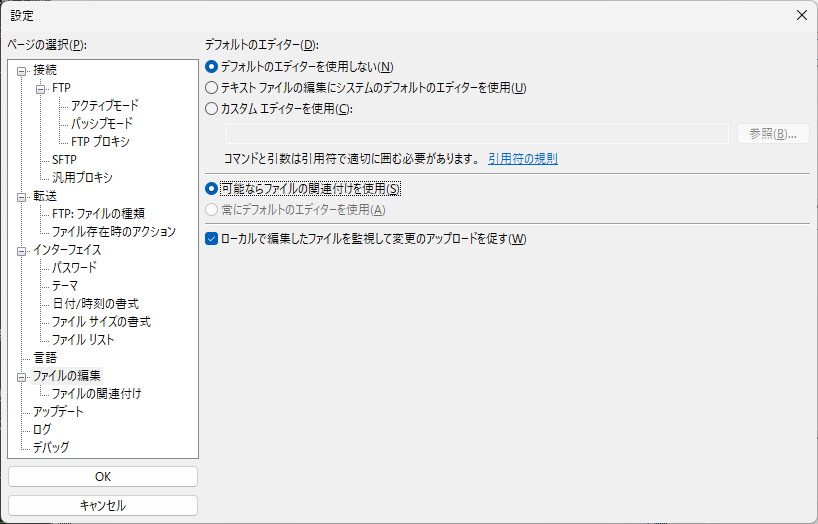 1. 概要 「FileZilla」で作業中に、ローカルやリモートのファイルを右クリックして、編集することができます。 編集する際、デフォルトでは、「NOTEPAD.exe」を開こうとするのですが、「NOTEPAD」は、や、ですよね。 2. 設定 「編集」→「設定」で、設定ダイアログを開いて。 「転ファイルの編集」タブで。 「カスタムエディタを使用」をチェックします。