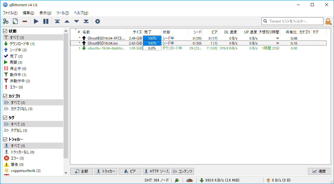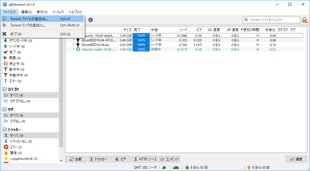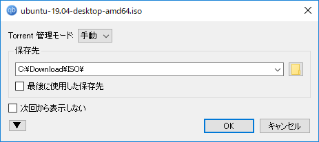 「ファイル選択ダイアログ」が開きますので .torrent ファイルを選択します。 わたしは、ダウンロードするファイルの保存先を毎回手動設定するように設定していますので 保存先選択のダイアログが開きます。 保存先を設定して 「OK」 共有先を探して あれば、ダウンロードが始まります。 |