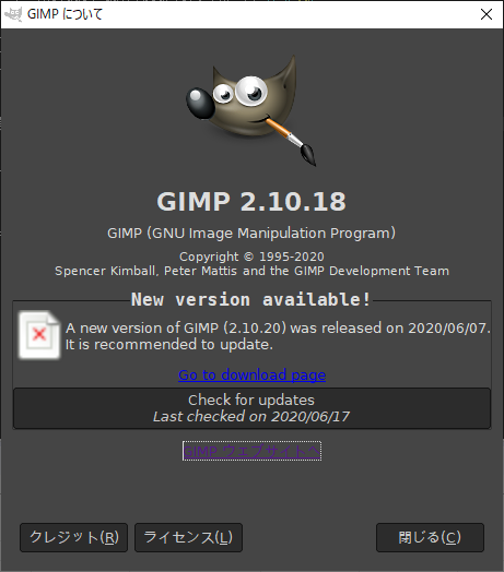 1. 更新チェック促進 ここのところ(2020年6月17日)、「GIMP」の起動時に下記の画面が出ていました。