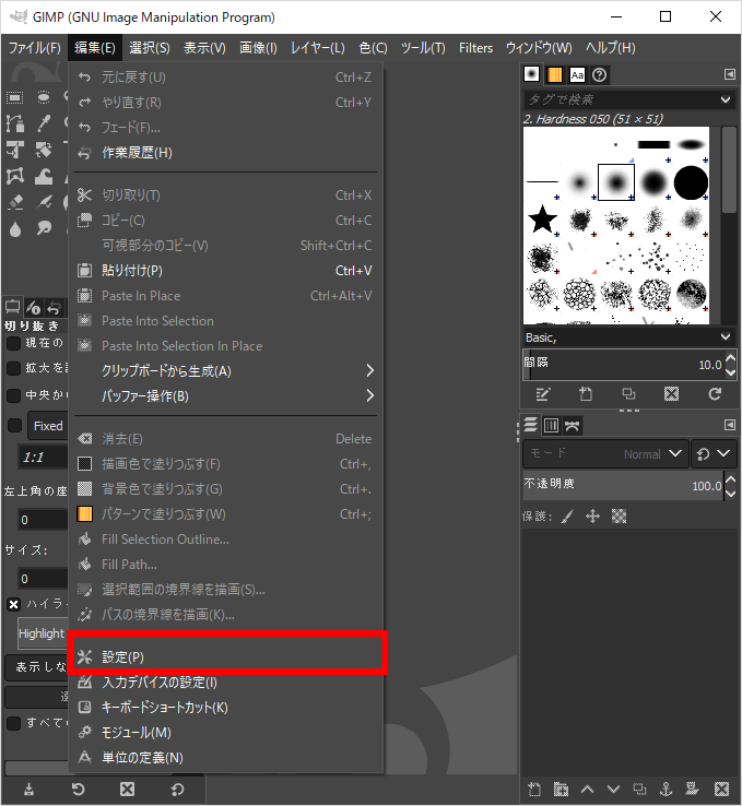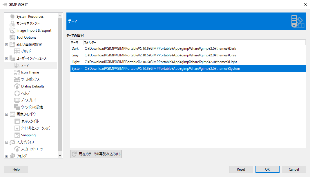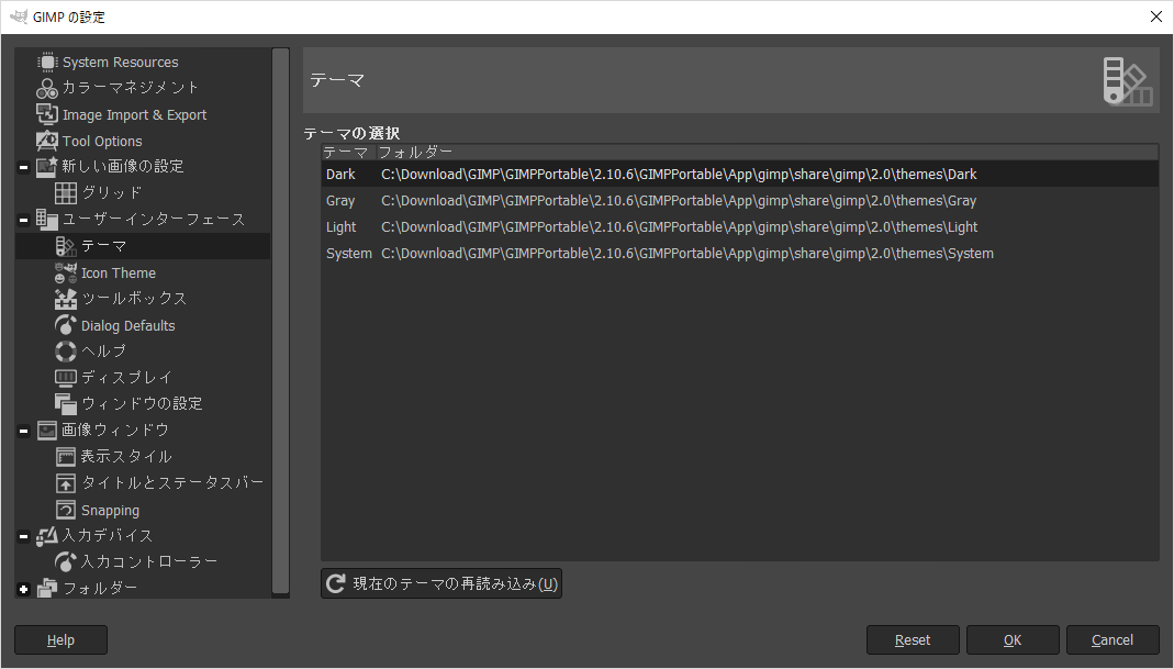GIMP - 2.10 操作 - テーマを変更する - 組込済のテーマで変更する