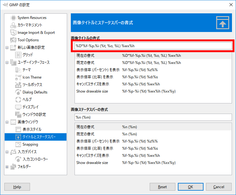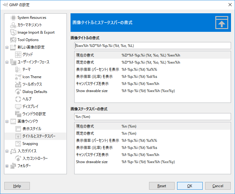 こんな長くはいらないのだ。 長くてもいいが、わたしが一番見たいのは、画像のサイズの部分なのです。 2. 画像タイトルの設定 「編集」→「設定」 「画像ウィンドウ」 「タイトルとステータスバー」