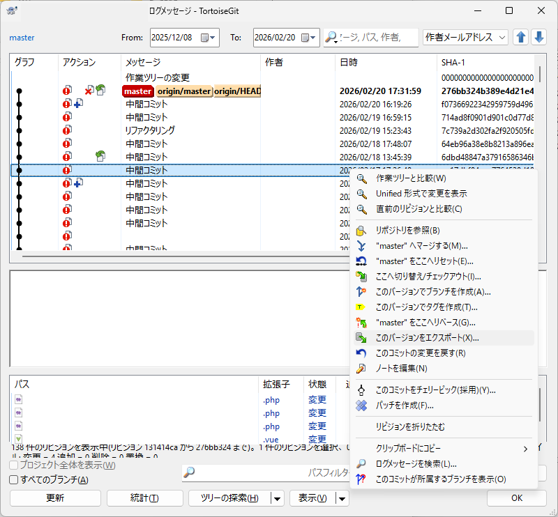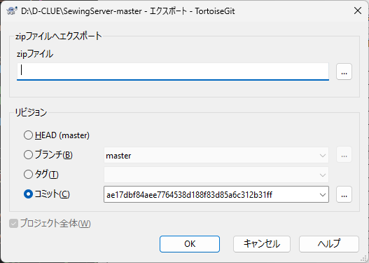 ファイル名を指定して「OK」 ファイルは、「.zip」形式で出力されますので、解凍すれば使えます。 「SVN」と異なるのは、「SVN」は、リポジトリとして全体が出力されますが、「Git」では、そのリビジョンで登録されているファイルのみを取得することになります。 |
