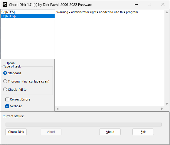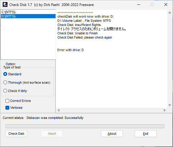 左上の枠内で、チェック対象のディスクを選んで、オプションを決めたら左下の「ドライブのチェック」を押下するだけです。