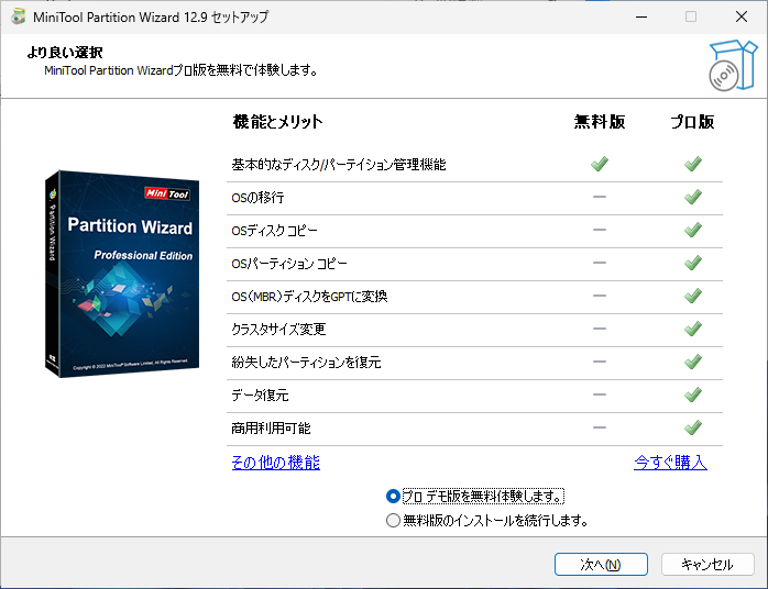 デフォルトは、「プロ デモ版無料体験します」にチェックがはいっています。