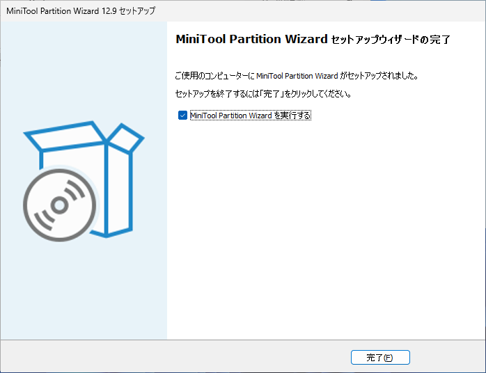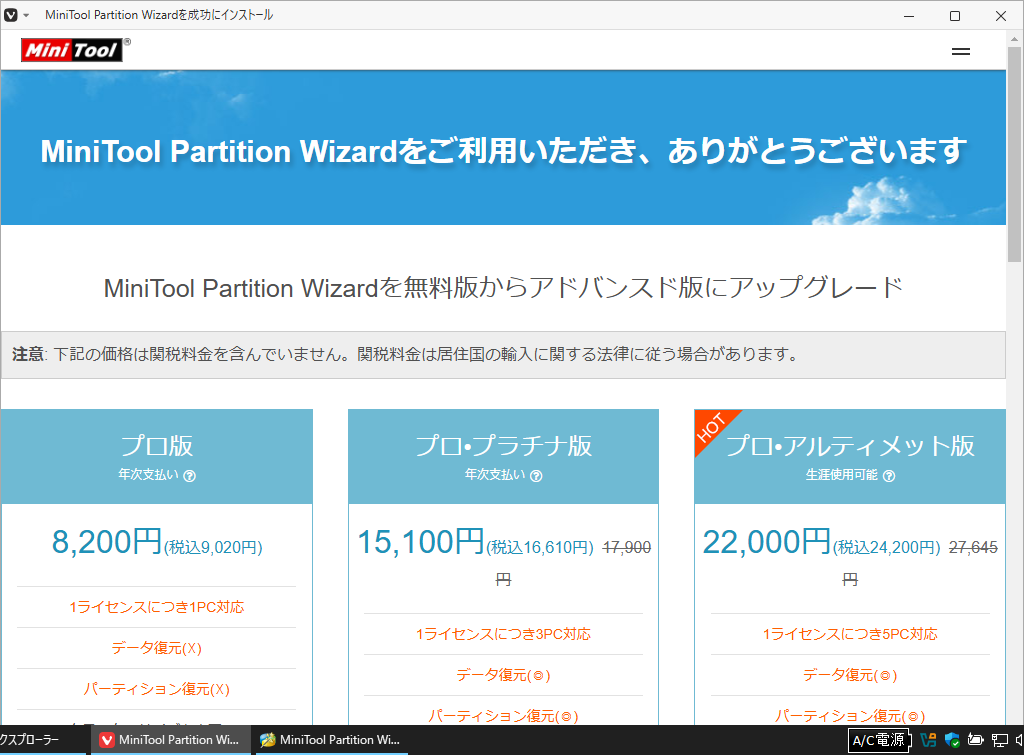 「完了」を押下して、「MiniTool Partition Wizard」を起動すると、同時にブラウザが開いて、下記のページが表示されます。