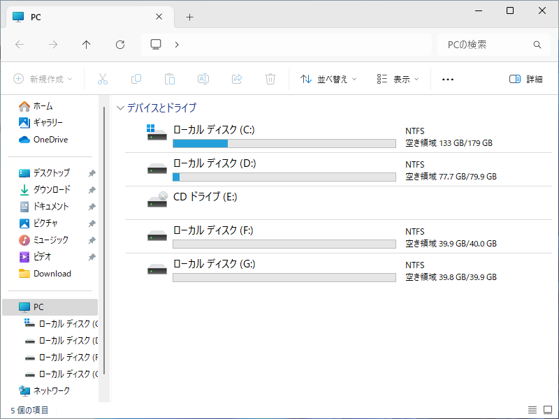 プログラムを終了して、エクスプローラで、パーティションの分割を確認しました。