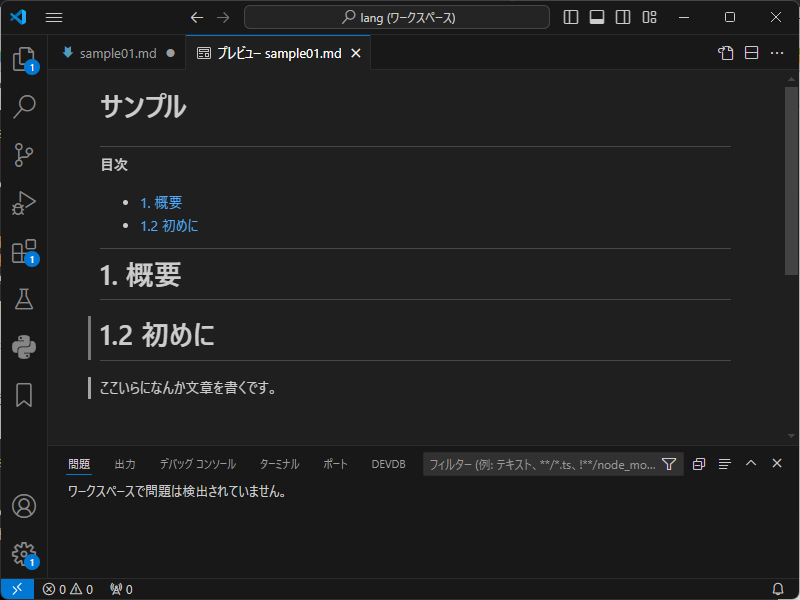 「Markdown All in One」をインストールしていれば、文書作成中に、目次を作成することができます。
