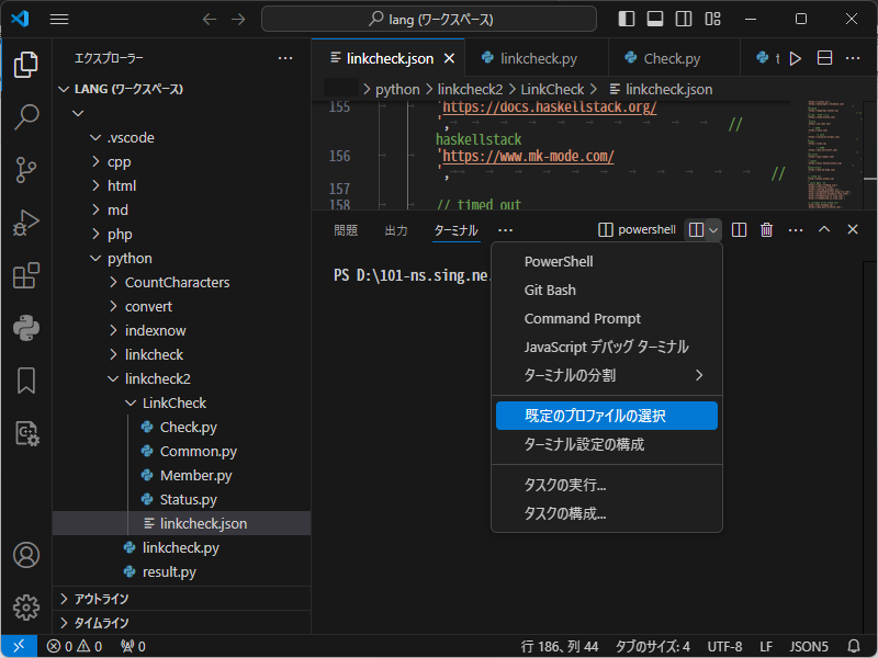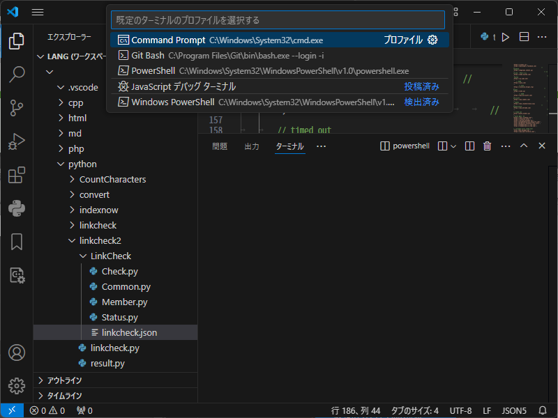 Visual Studio Code - ターミナル - デフォルトシェル変更