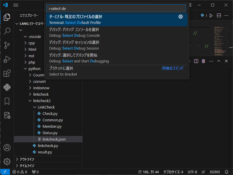 Ctrl+Shift+P でコマンドパレットを開いて、「select default profile」と入力することで表示することができます。