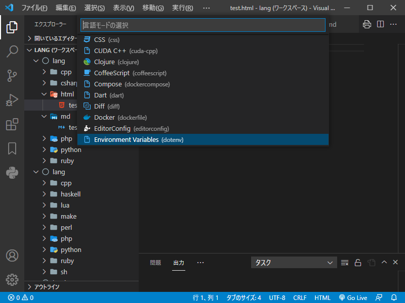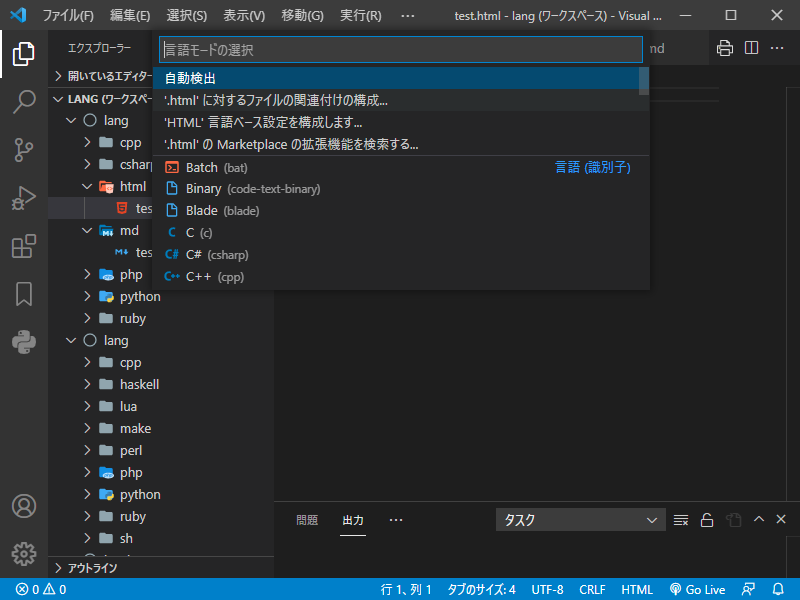 ここで、現在の言語モードの「ファイルの関連付けの構成」やら「言語ベースの設定」やらを見れたり、言語に対する拡張機能を検索することもできるようですし・・・。