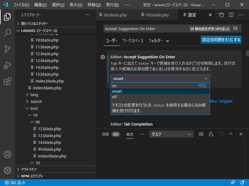 「Accept Suggestion On Enter」と打ちゃ、最上位に来ます。 「on」の状態がデフォルト 「smart」「off」が候補にあります。 「smart」にするだけでも、少し効果があります。 「setting.json」に入力するなら右の値を変更して設定します。 |