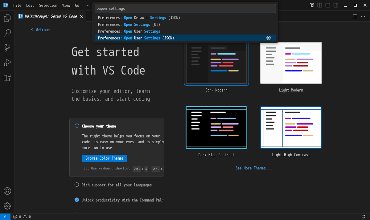 「Open User Settings(JSON)」で「setteings.json」を開きます。