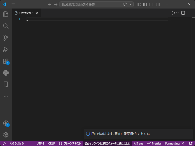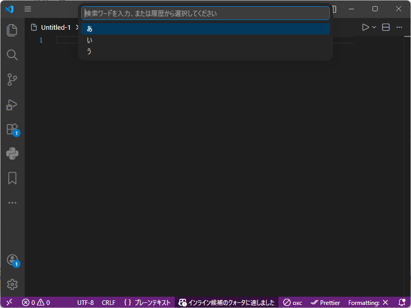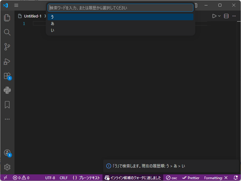 多くのエディタでは、検索の履歴は、以前に検索したものをもう一度検索すると、履歴の最上位にもってきますが、「Visual Studio Code」は、履歴の順番が変わらないので、以前に検索したものを探すには、新規に入力するか、履歴に表示されるまで、ひたすら上矢印で探さなければならない。