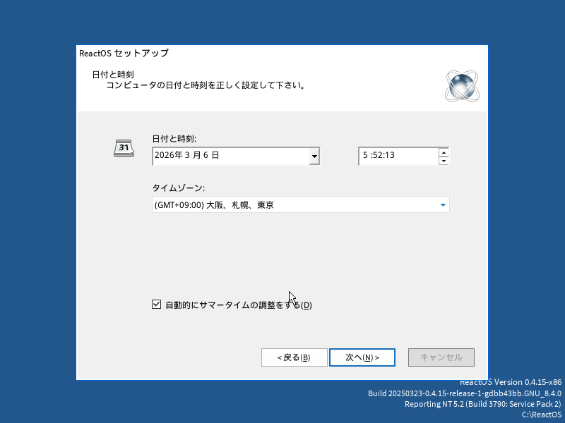 念のため「自動的にサマータイムの調整をする」のチェックをはずして「次へ」