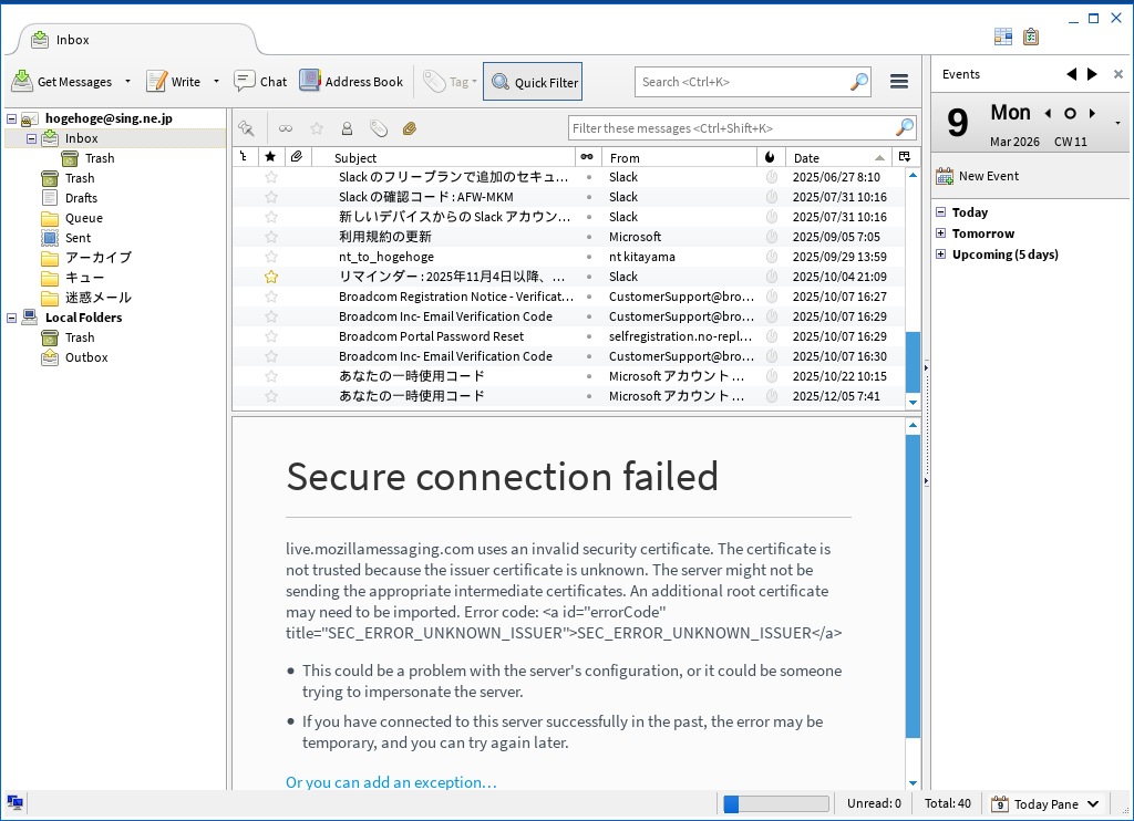 起動後に、メールアドレス設定を行った後、受信メールフォルダを開いた状態です。