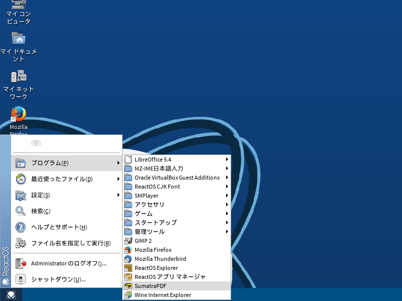 1. 概要 「PDFリーダ」として「SumatraPDF」を使用します。 2. インストール 「ReactOS アプリマネージャ」で、「オフィス」「SumatraPDF」を選択して、インストールします。 3. 起動 「スタート」→「プログラム」→「SumatraPDF」