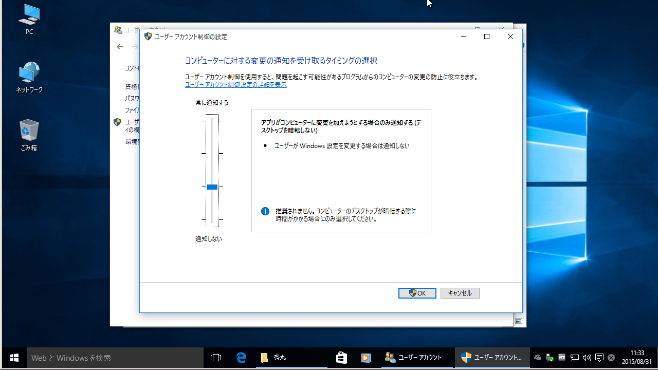 Windows10 - 基本操作 - ユーザーアカウント制御設定の変更