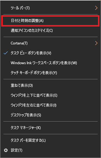 ツールバーの時刻表示を右クリック →「日付と時刻の調整」