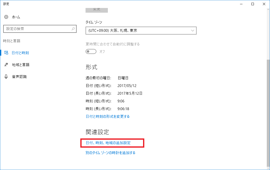 下部の「日付、時刻、地域の追加設定」