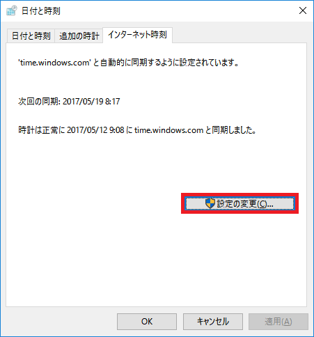 デフォルトで「time.windows.com」というタイムサーバが設定されています。