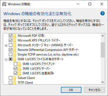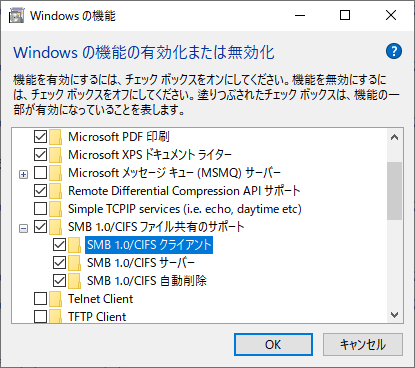 「SMB 1.0/CIFS クライアント」のチェックがはずれているので