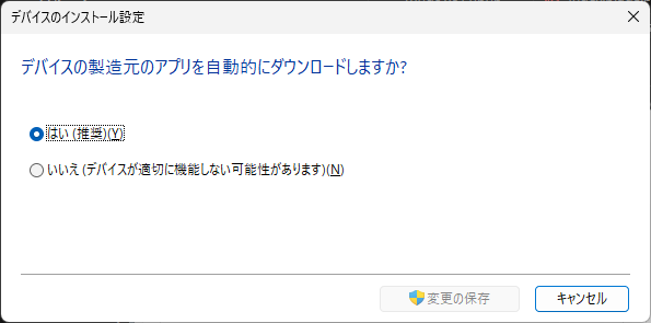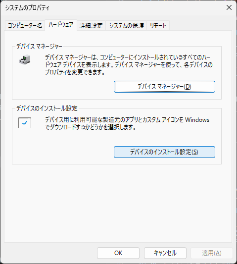 「システムのプロパティ」が開きますので「ハードウェア」タブで、「デバイスのインストール設定」
