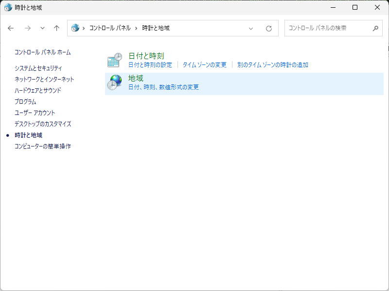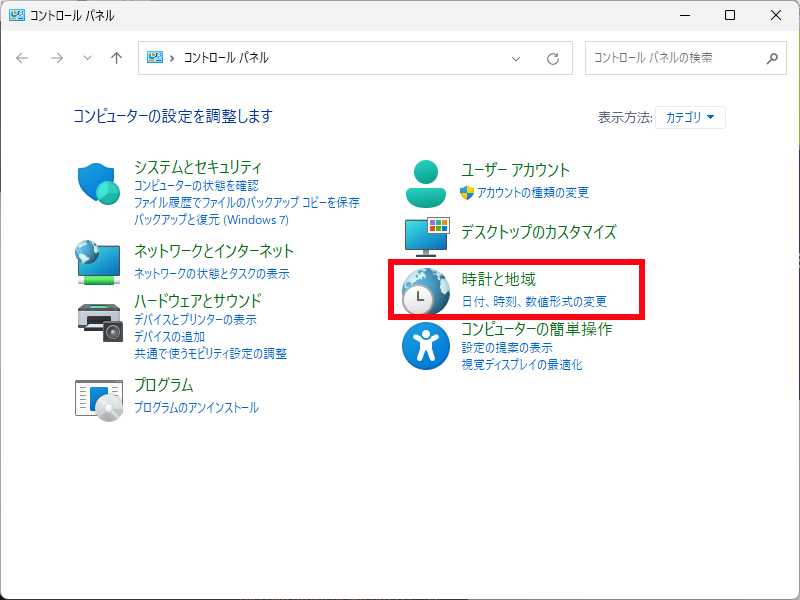 「control」と入力して、Enter で、コントロールパネルを起動し。
