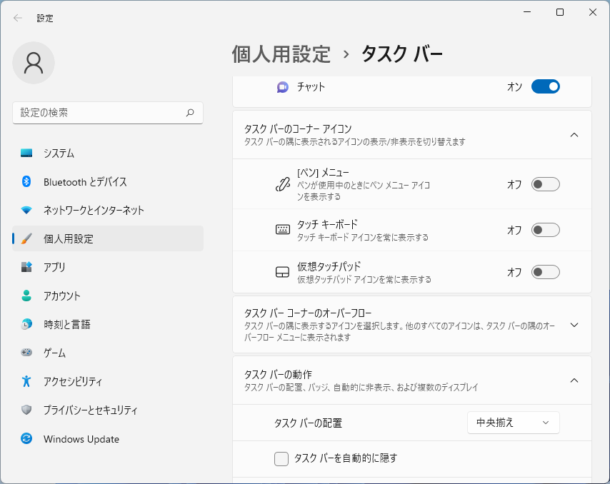「タスクバーの動作」ちゅうのが隠れているので、クリックして表示すると