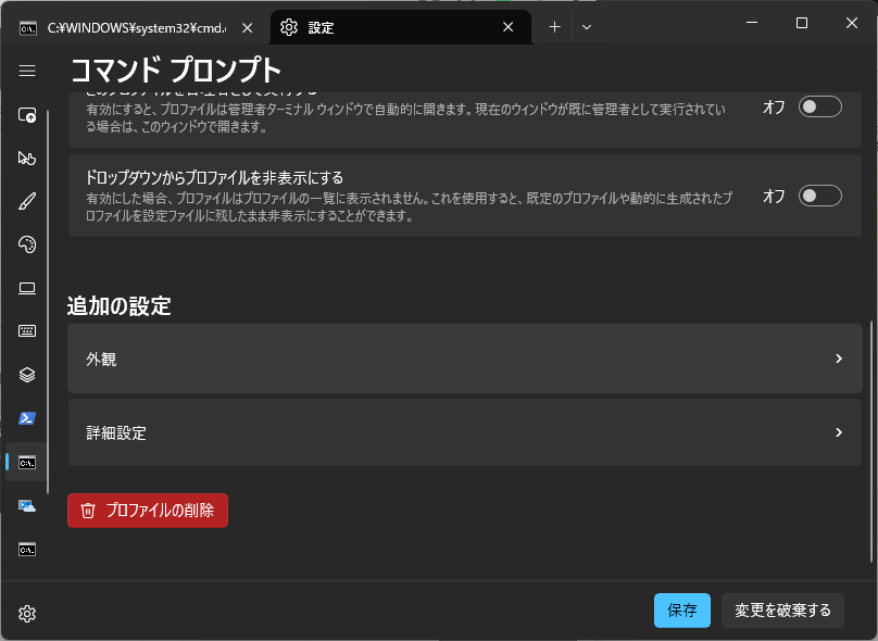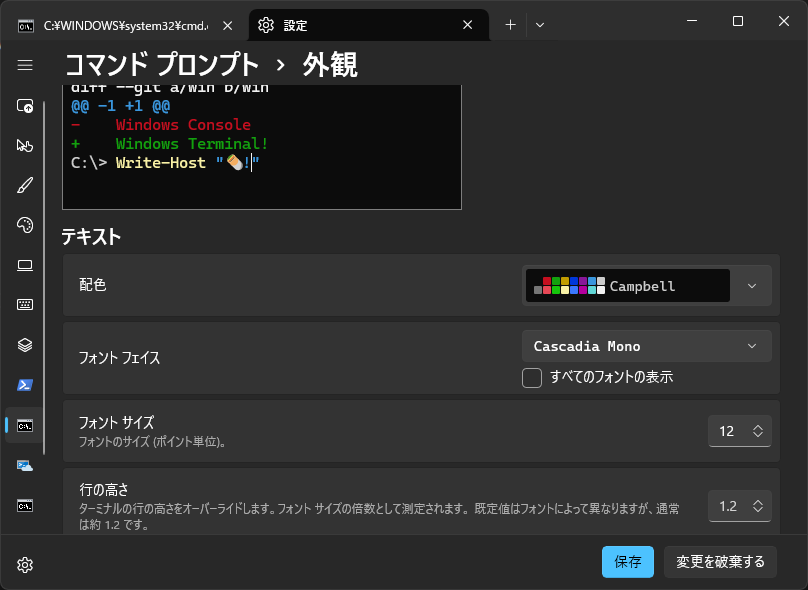 どうでしょう。 好みの問題なのですが、わたしは、好かん。 ハンバーガーメニューを開いて、「コマンドプロンプト」 「外観」 「フォントフェイス」で、設定したいフォントを設定して、「保存」すれば、フォントを変更できます。 |