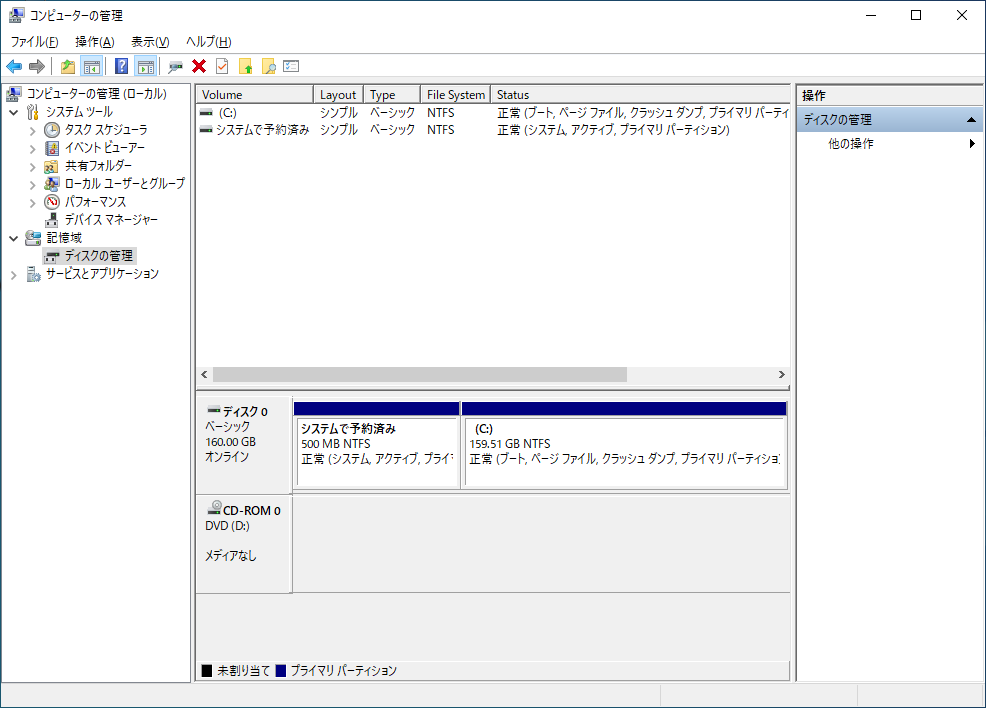 元の「C」ドライブの容量が小さかったので、拡張して大きくしたのですが、回復パーティションを削除しないと、「C」ドライブのパーティションを大きくできないのです。