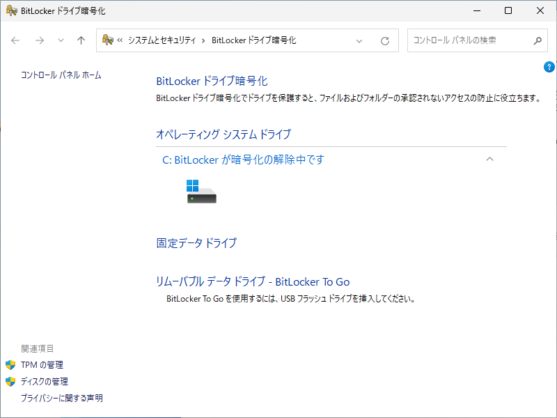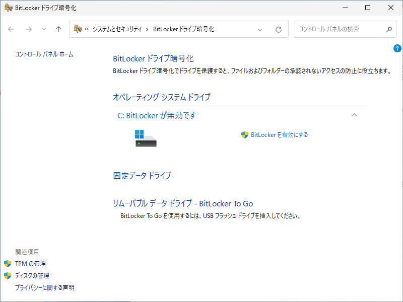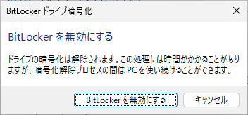 「BitLocker を有効にする」と表示されれば、無効化は完了です。