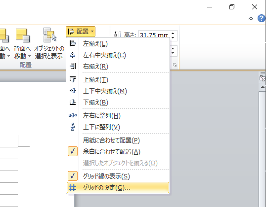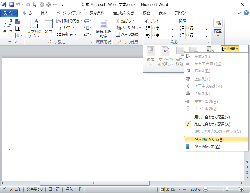 「ページレイアウト」→「配置」→「グリッド線の表示」で