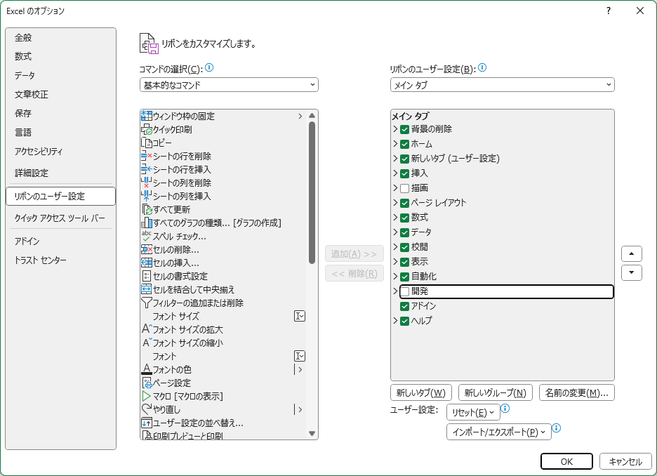 「リボンのユーザ設定」タブで。 右側の枠で、「開発」というチェックボックスが、デフォルトではチェックなしになっているかと思います。 これにチェックをいれます。 すると「開発」というタブが有効になって、操作できるようになります。