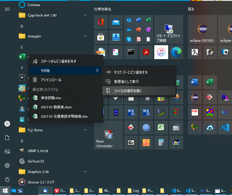 「スタート」→「E」→「Excel」右クリック「その他」→「ファイルの場所を開く」