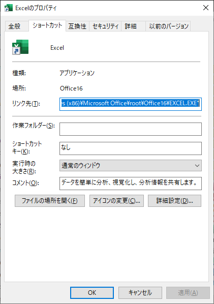 リンク先の中に、先ほどの値の前半部分(「Excel」のフルパスとロードモジュール名)がはいっていますので、そのままコピーできます。