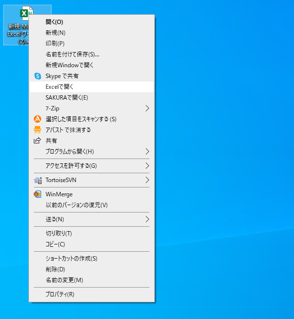 ファイルを右クリックすると、選択肢に「Excelで開く」という、前項で設定したコマンドがありますので、それを選択します。