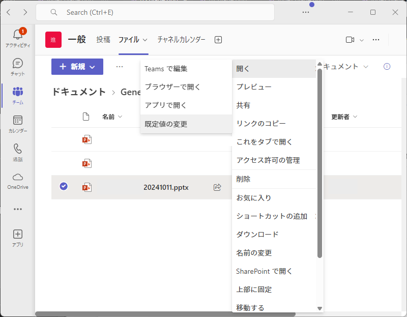 そうすると、同じアクションで、「Teams」内で、「PowerPoint」で開くことができます。