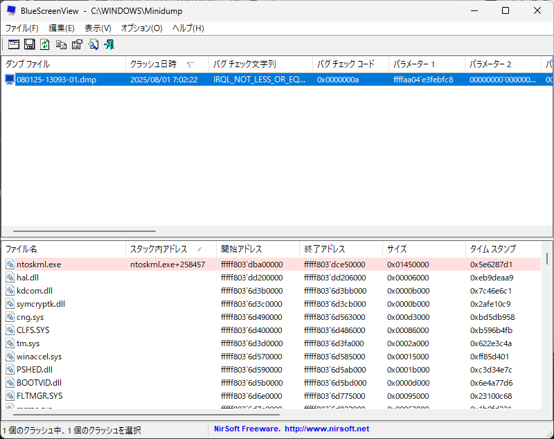 再起動後、「ブルースクリーン解析 BlueScreenView」を使って、イベントを解析しました。