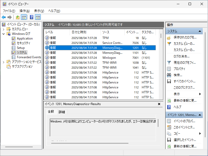 「Windows ログ」「システム」で「Memory Diagnostics-Results」を見ます。