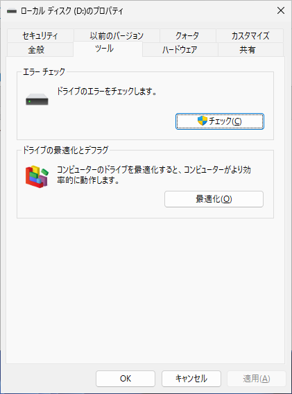 ディスクのチェックは、エクスプローラで、ディスクを右クリックして、プロパティでダイアログを開いて。