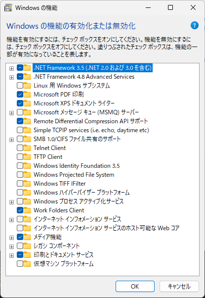 「Windows の機能の有効化または無効化」