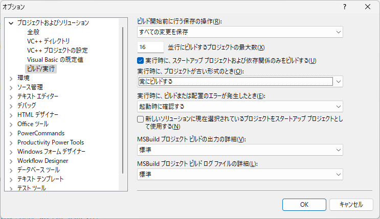 「プロジェクトおよびソリューション」「ビルド/実行」タブで