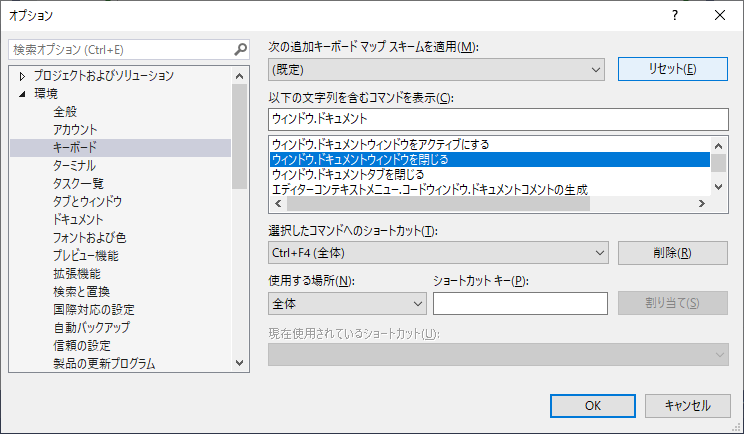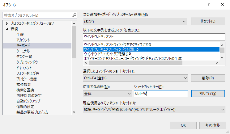 「Visual Studio 2022 でキーボードショートカット変更(Ctrl + W でタブウィンドウ閉じるように、など) #Windows10」