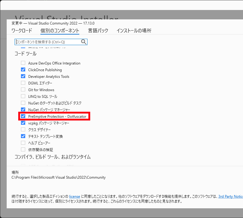 「Preemptive Protection - Dotfuscator」のチェックがはいっていれば、インストール済です。