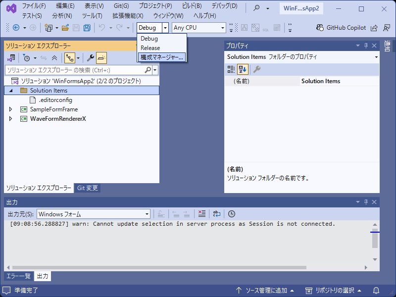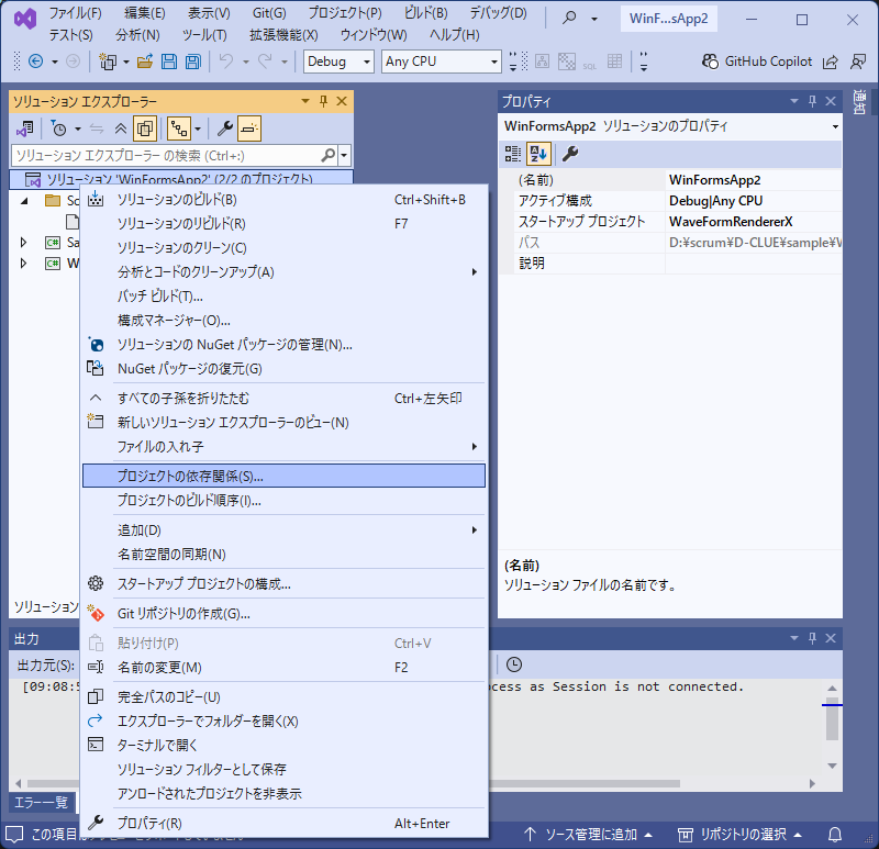 ソリューションエクスプローラで、ソリューションもしくはプロジェクトを右クリックして。