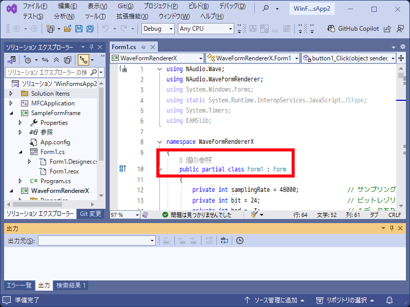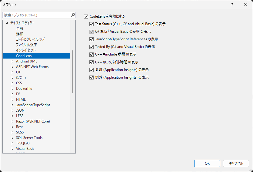 編集している最中は、邪魔になることがあります。 参照の表示は、非表示にできます。 本ページは、下記のサイトを参考にさせていただきました。「[.NET][Visual Studio]CodeLensを非表示にする。(○○個の参照)」 本当は「C# および Visual Basic の参照の表示」のみチェックを外したいのですが。 わたしの環境では、これのみのチェックをはずすことはできませんでした。 |