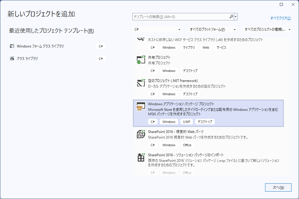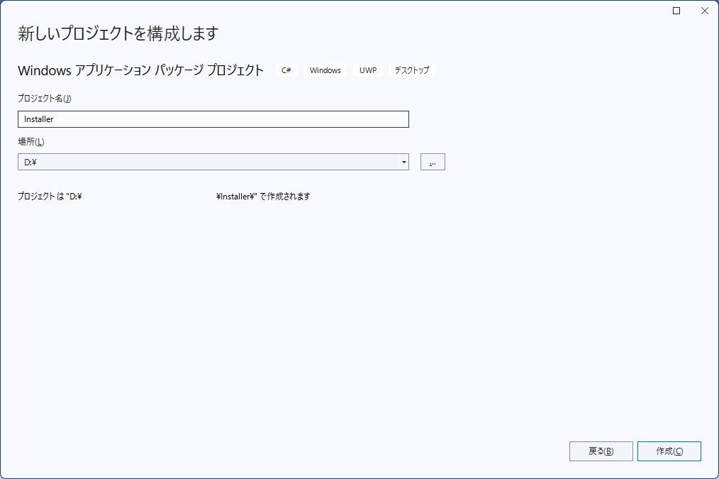 1. 概要 インストーラのプロジェクトを作成します。 2. プロジェクト追加 ソリューションを右クリックして。 「追加」→「新しいプロジェクト」 「Windows アプリケーション パッケージプロジェクト」を選択して「次へ」