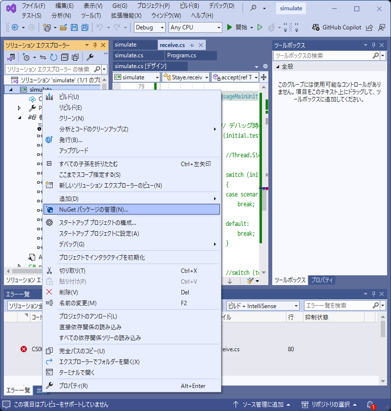 プロジェクトを右クリックして「NuGet パッケージの管理」