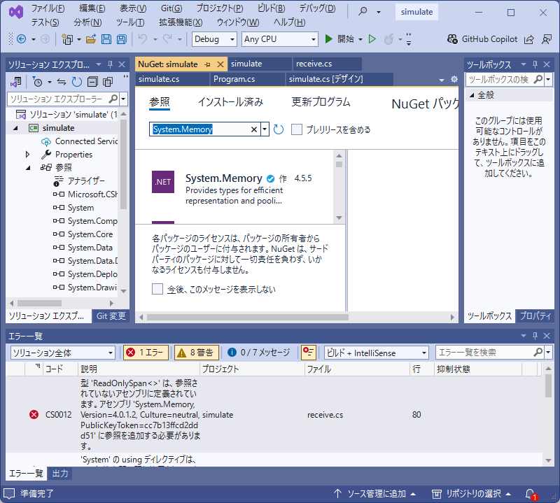 エラー (アクティブ) CS0012 型 'ReadOnlySpan<>' は、参照されていないアセンブリに定義されています。アセンブリ 'System.Memory, Version=4.0.1.2, Culture=neutral, PublicKeyToken=cc7b13ffcd2ddd51' に参照を追加する必要があります。